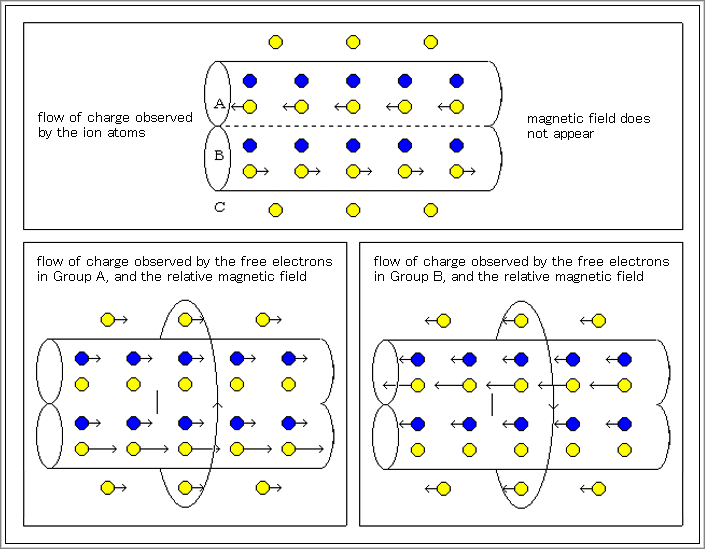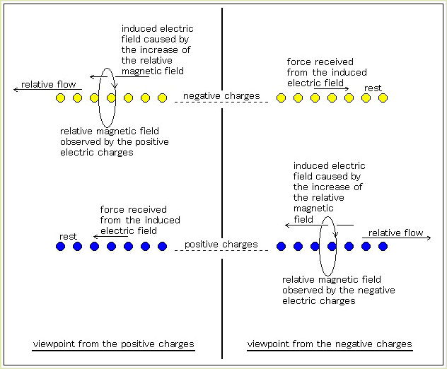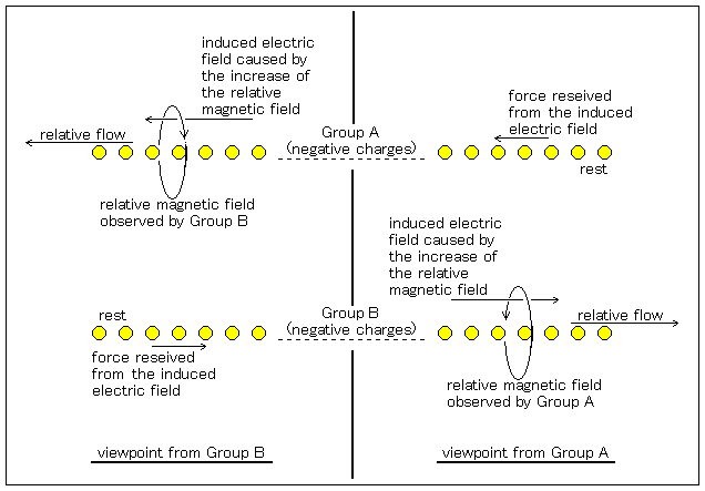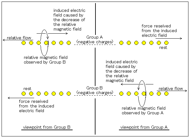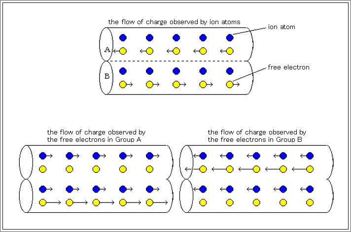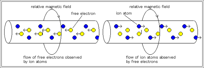First, let's envision a conduction current which would not bring the self-induction. This means the current without its magnetic field, that is, the two-way currents. When two kinds of currents, that have the same quantity and the opposite directions, flow into the tightly fit two electric wires one by one, the magnetic fields never appear to be resisting each other. Thinking these double-wires as a single conductor, from the viewpoint of the ion atoms, the flow quantity of the free electrons flowing to the left is equal to the one flowing to the right. Accordingly, the magnetic field does not appear from the viewpoint of the ion atoms. Thinking of this condition from the sight of the free electrons flowing to the left, half as many the free electrons as the ion atoms flow to the right at double the speed of the ion atoms. That is, the flow quantity of the free electrons is equal to the one of the ion atoms. Accordingly, the magnetic field does not appear as well from the viewpoint of the free electrons flowing to the left. On the other hand, considering the situation from the sight of the free electrons flowing to the right, half as many the free electrons as the ion atoms flow to the left at double the speed of the ion atoms. That is, the flow quantity of the free electrons is equal to the one of the ion atoms. Accordingly, the magnetic field does not appear as well from the viewpoint of the free electrons flowing to the right.