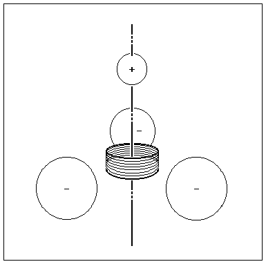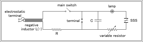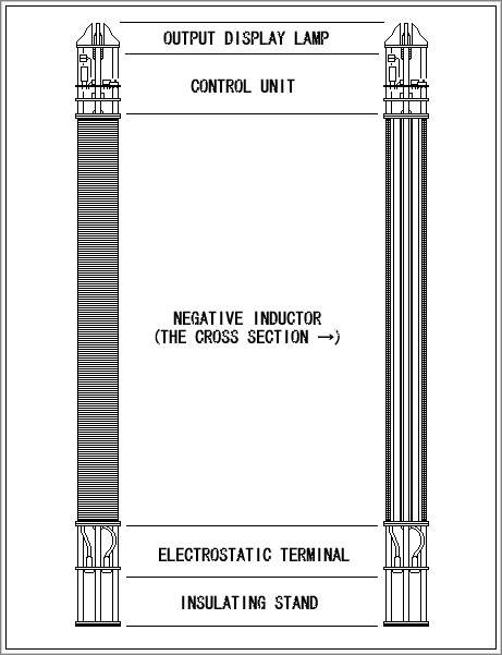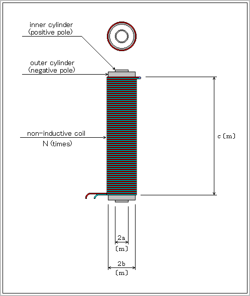 CHART 6 is a sample of the simplest negative inductor. In order to increase the electrostatic capacity of the magnetic core , two aluminium cylinders with different diameters are set coaxially as a magnetic core. Winding up the two immediate enamelled wires thickly to the outer cylinder (in the chart, a wire is indicated with blue, another with red), the ends of one of the wires close and the ends of other open. The two opened ends become the connecting terminals of the negative inductor. To make the relative magnetic field which is observed from the free electrons flowing in the coil, appear in the direction which brings the opposite self-induction, it is necessary to electrify the outer cylinder into negative and the inner cylinder into positive. If the cylinders are charged with the opposite polarities, the positive inductance occurs in the double coils.